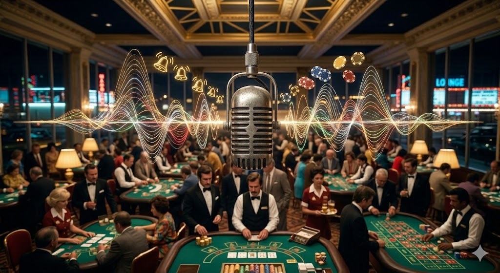 Kasinon äänimaailma on yksi tunnistettavimmista elokuvallisista ympäristöistä. Peliautomaattien elektroniset äänet, korttien sekoittaminen ja rulettipallon pyörintä luovat jatkuvan taustahuminan, joka viestii mahdollisuuksista. Elokuvantekijät käyttävät tätä ääntä rakentaakseen jännitystä; kun pallo alkaa hidastua, muu maailma usein vaimenee ja jäljelle jää vain yksi ääni. Musiikilla on myös suuri rooli: klassinen Vegas-soundi (Frank Sinatra, Dean Martin) luo nostalgista tunnelmaa, kun taas modernit trillerit käyttävät syntetisaattoreita ja nopeaa tempoa korostamaan adrenaliinia.