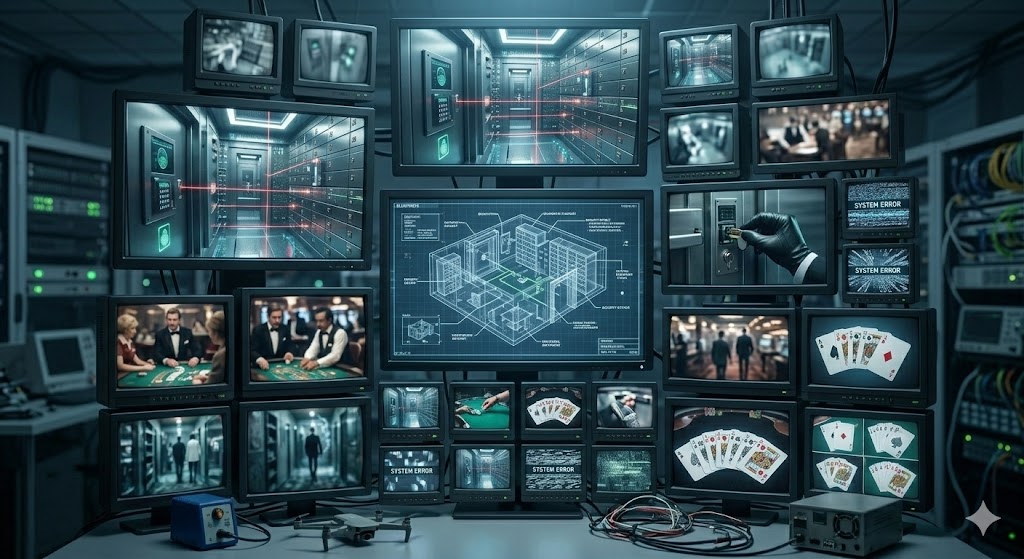 Kasinot ovat houkuttelevia kohteita elokuvallisille ryöstöille niiden sisältämän valtavan käteismäärän vuoksi. Ocean’s Eleven (2001) ja sen jatko-osat ovat täydellisiä esimerkkejä tästä alalajista. Näissä elokuvissa painopiste ei ole itse pelaamisessa, vaan kasinon monimutkaisten turvajärjestelmien murtamisessa. Kasino kuvataan linnoituksena, jossa on lasersäteitä, kasvojentunnistusta ja murtovarmoja holveja. Ryöstöelokuvat korostavat kasinon teknistä puolta ja sitä, miten talo on aina askeleen edellä tavallista varasta – paitsi jos kyseessä on elokuvallinen supertiimi.